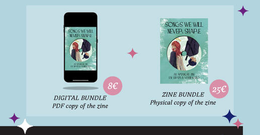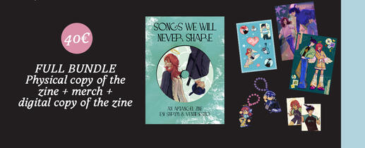 3. End of the contract.The fanzine consists of a main fanfiction with three chapters (10k in total) based in a music shop AU, and three other fanfics, all of them accompanied by an illustration. It also includes some comics and fanarts non-related to the fanfics.Songs we will never share is a fan project not affiliated with the original media in any way.